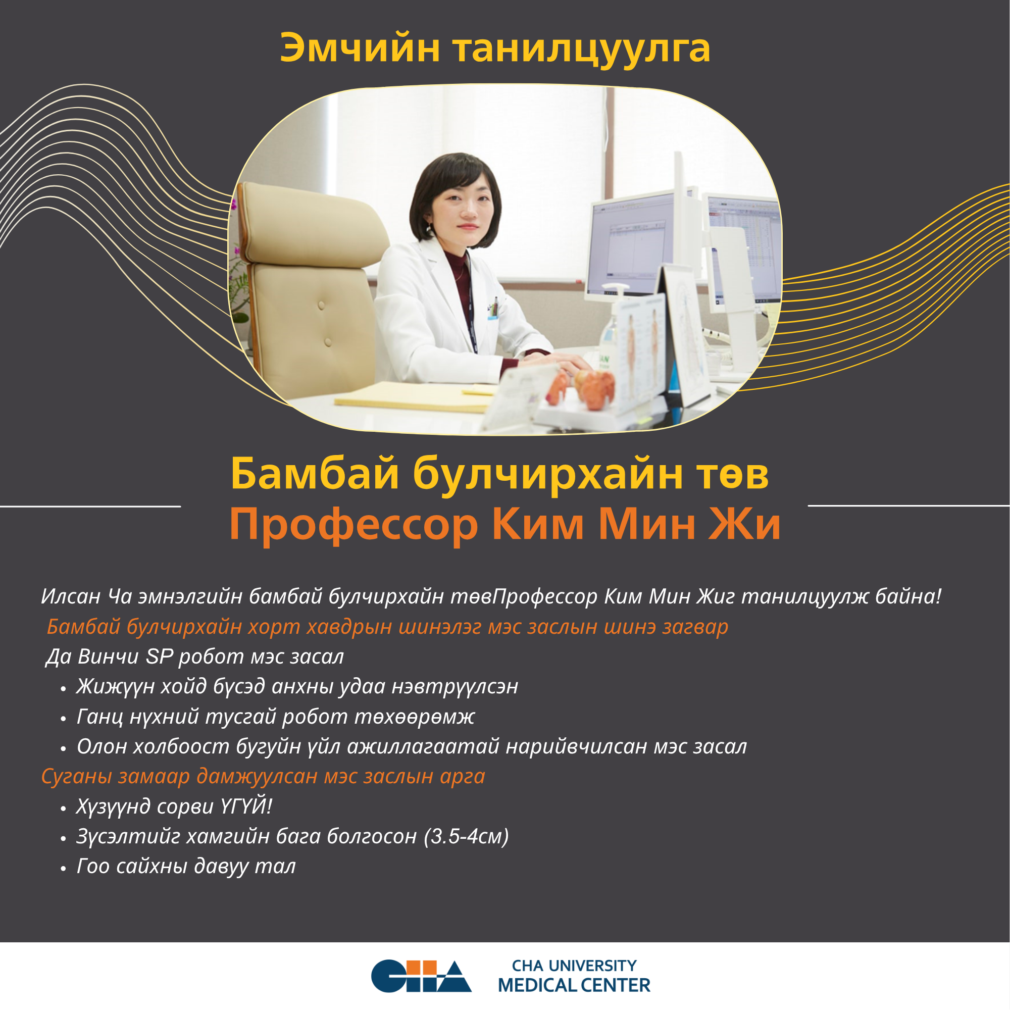 ✅ Хоолойны дуу хоолойн өөрчлөлтгүй, сорвигүй мэс засал! 🤖 Илсан Ча эмнэлгийн профессор Ким Мин жи – Далны доогуур робот хагалгаа Илсан Ча эмнэлгийн Бамбай булчирхайн хавдрын төвийн Ким Мин жи профессор нь хүзүүнд сорвигүй, нарийн мэс ажилбар болох Da Vinci SP робот хагалгааны аргыг амжилттай хийж байна.